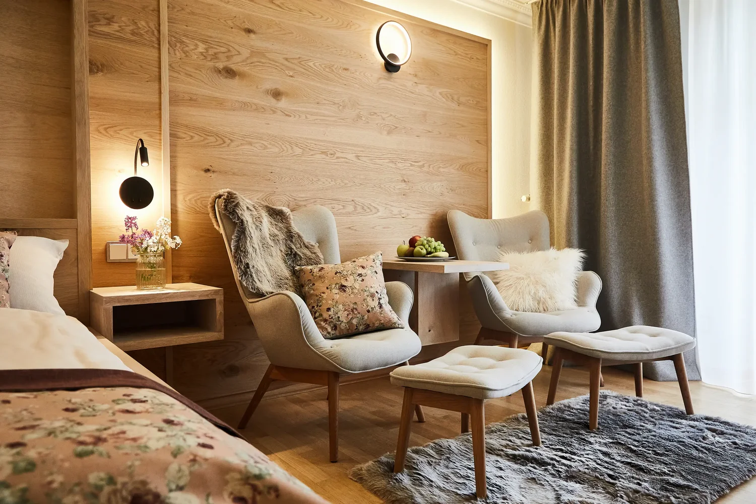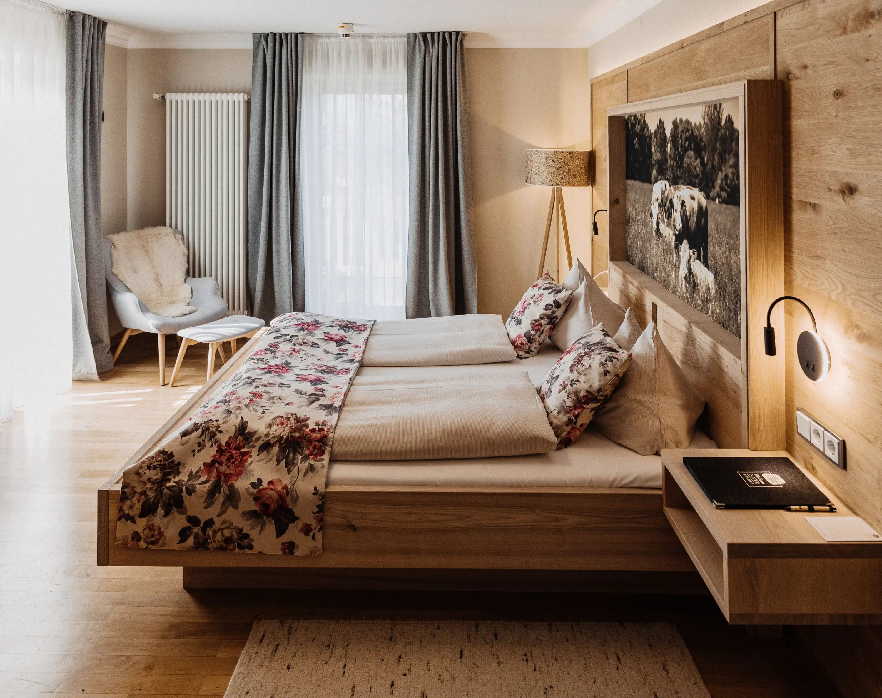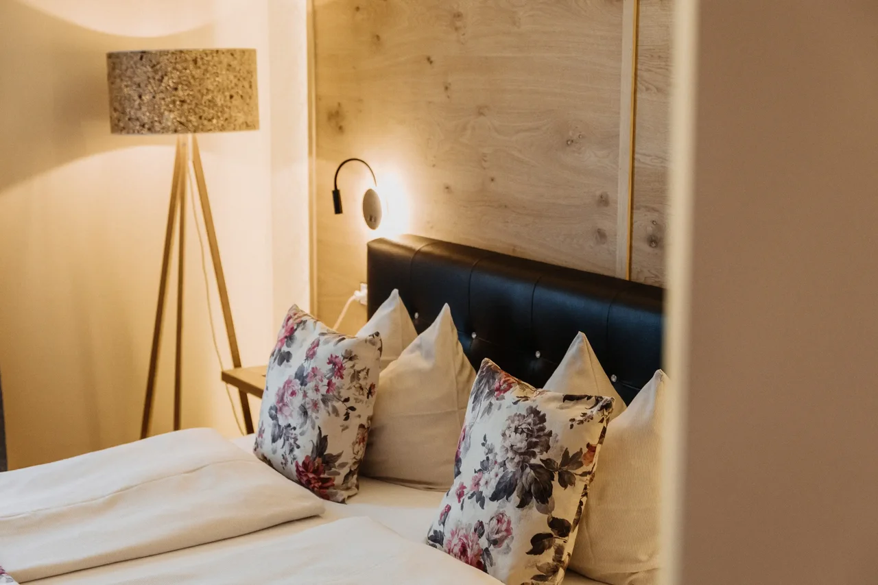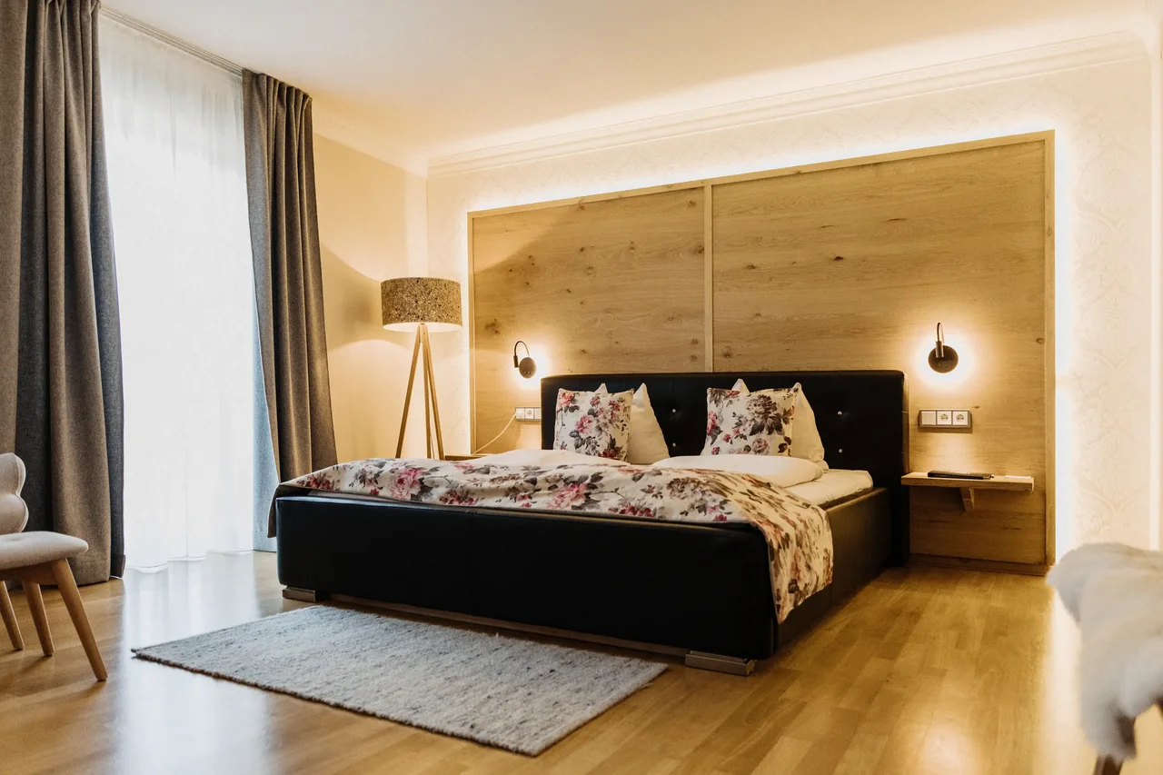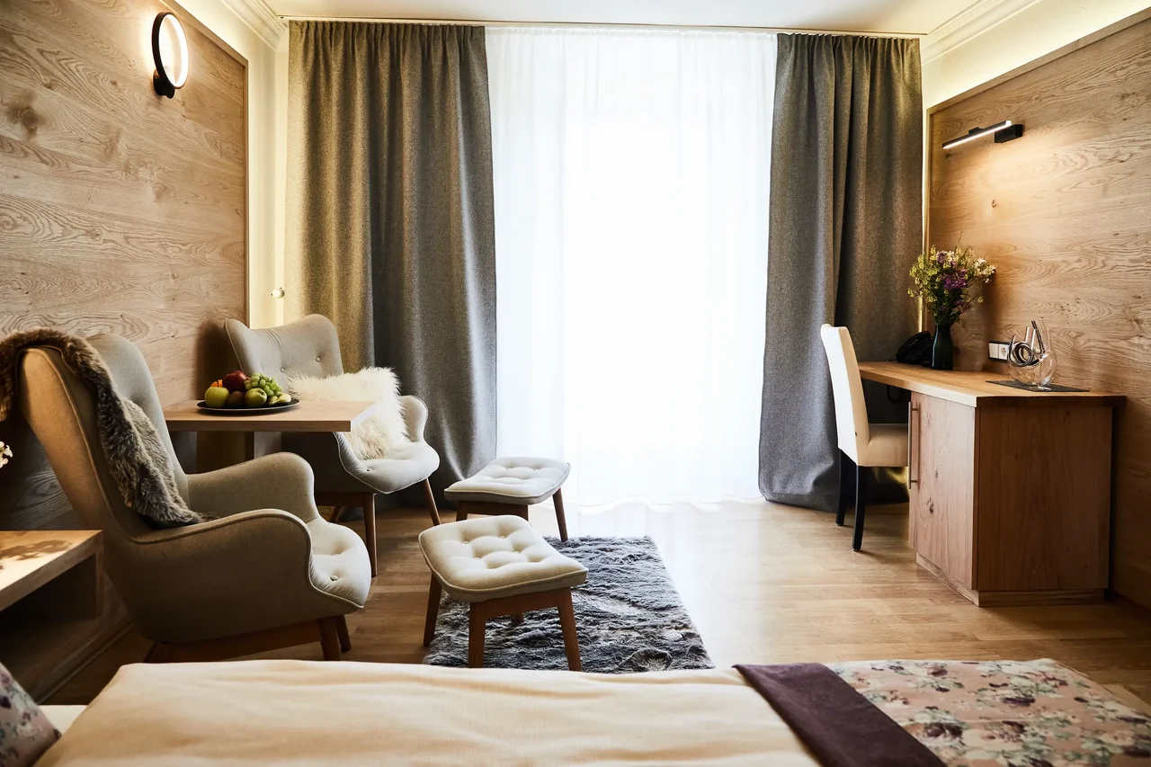 Die Zimmer im Gut Edermann sind je nach Kategorie und Ausrichtung unterschiedlich gelegen und bieten – abhängig vom Zimmertyp – Panoramablick, Bergblick oder eine ruhige Nordlage.