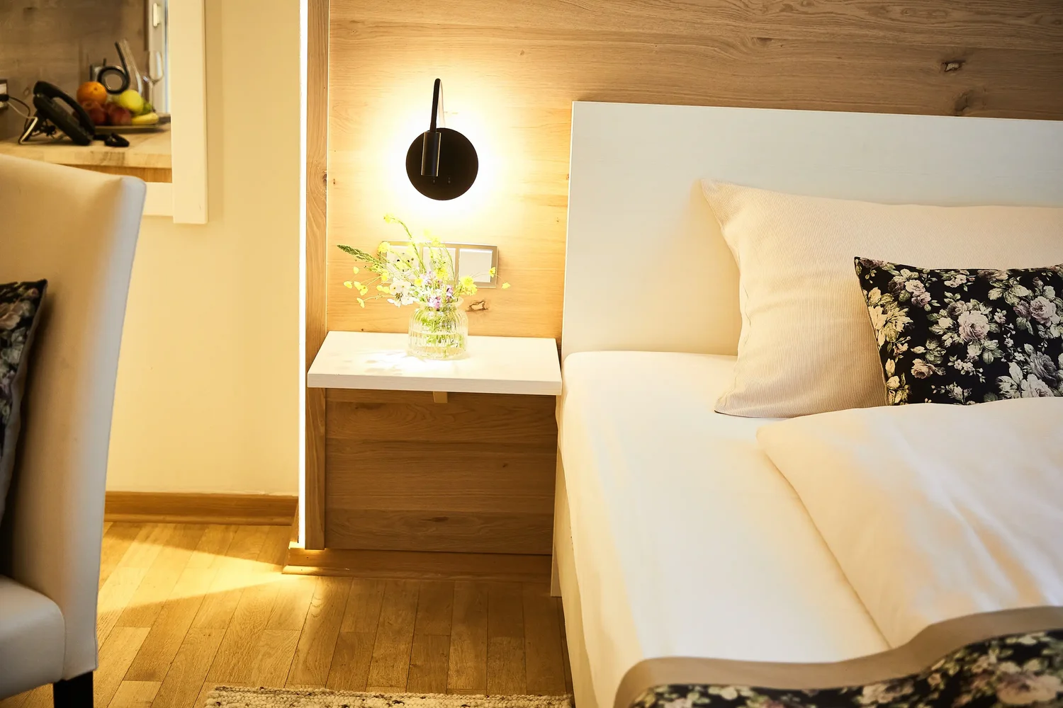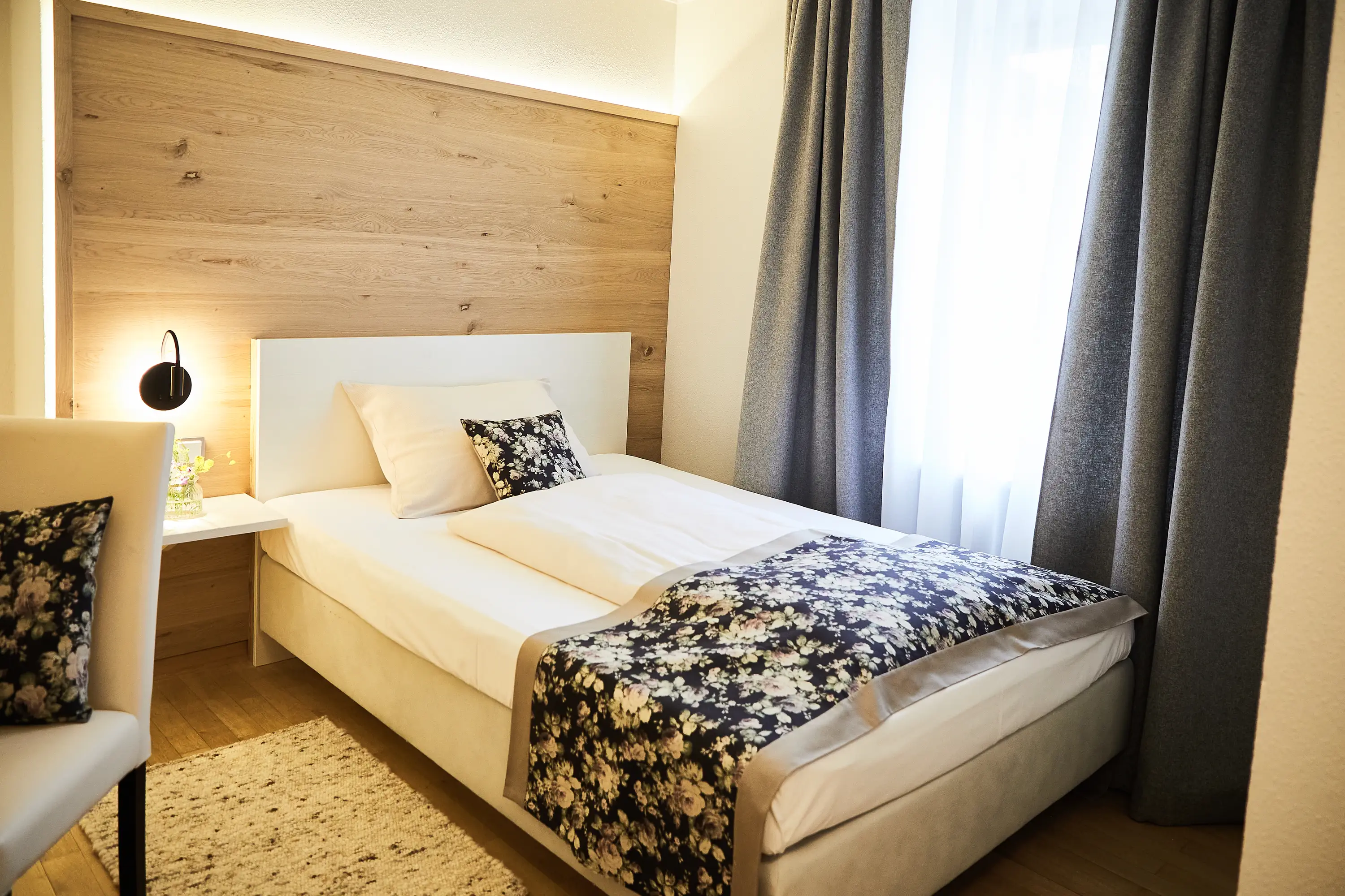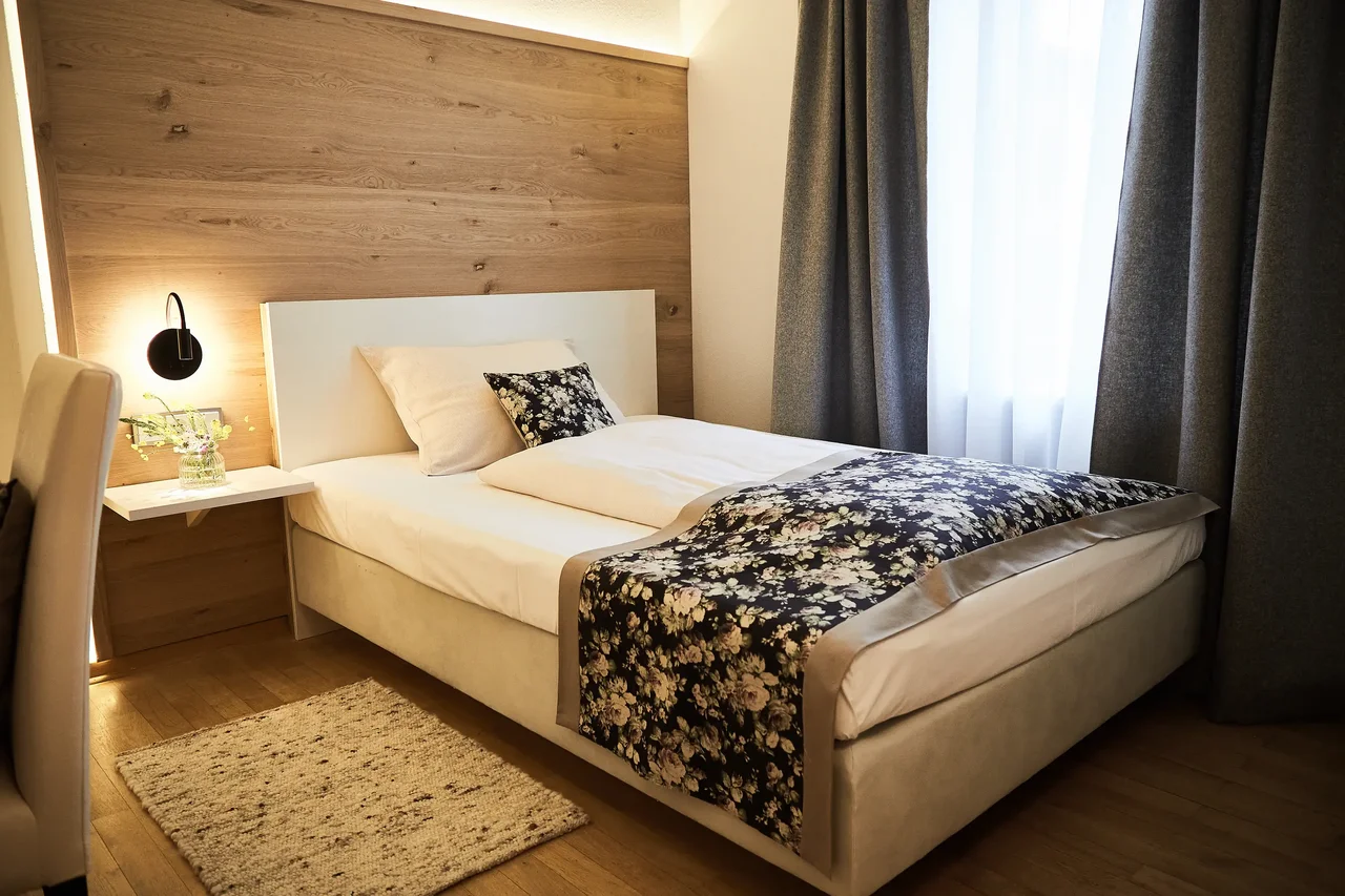 Mit 15–21 m² bietet das Einzelzimmer Högl einen klar strukturierten Raum für Alleinreisende. Naturholzboden, warme Materialien und ein 140 x 200 cm Einzelbett sorgen für angenehme Geborgenheit. Der abgetrennte Balkon schafft einen privaten Außenbereich – geschützt und ruhig. Ideal für Gäste, die Rückzug schätzen und dennoch Freiraum genießen möchten.