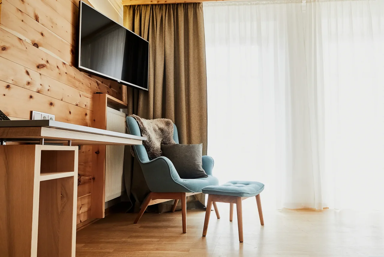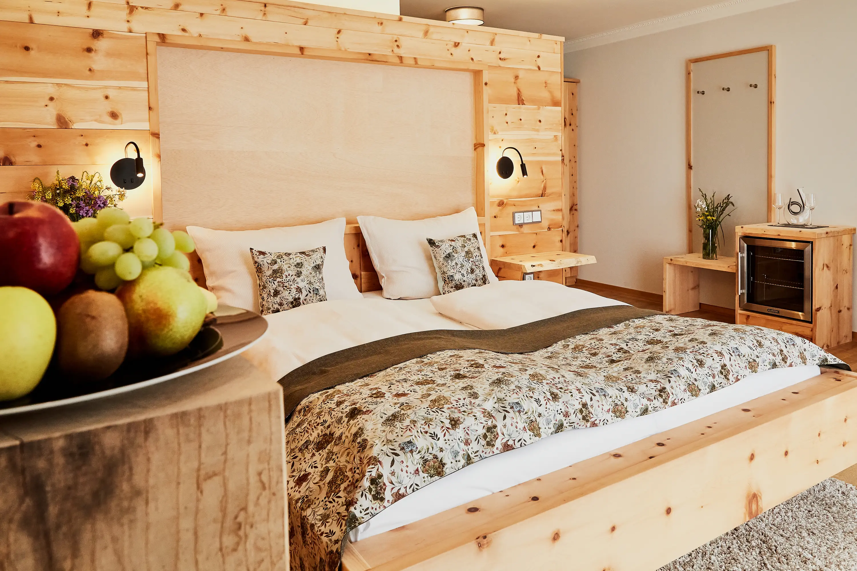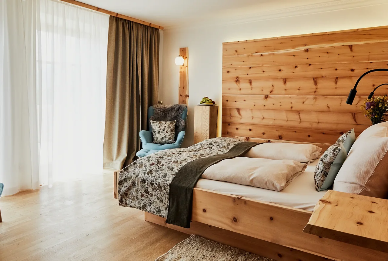 Auf rund 29–30 m² genießen Sie die wohltuende Wirkung von massivem Zirbenholz, kombiniert mit warmem Naturholzboden und alpiner Klarheit. Der Duft des Holzes schafft eine besonders ruhige Atmosphäre – ideal für tiefen Schlaf und echte Regeneration. Panoramablick oder Bergblick, gemütliches Doppelbett (180 × 200 cm) sowie Bad mit Dusche oder Badewanne sorgen für Komfort. Kaffeemaschine, Minibar und Spa-Tasche sind selbstverständlich inklusive.